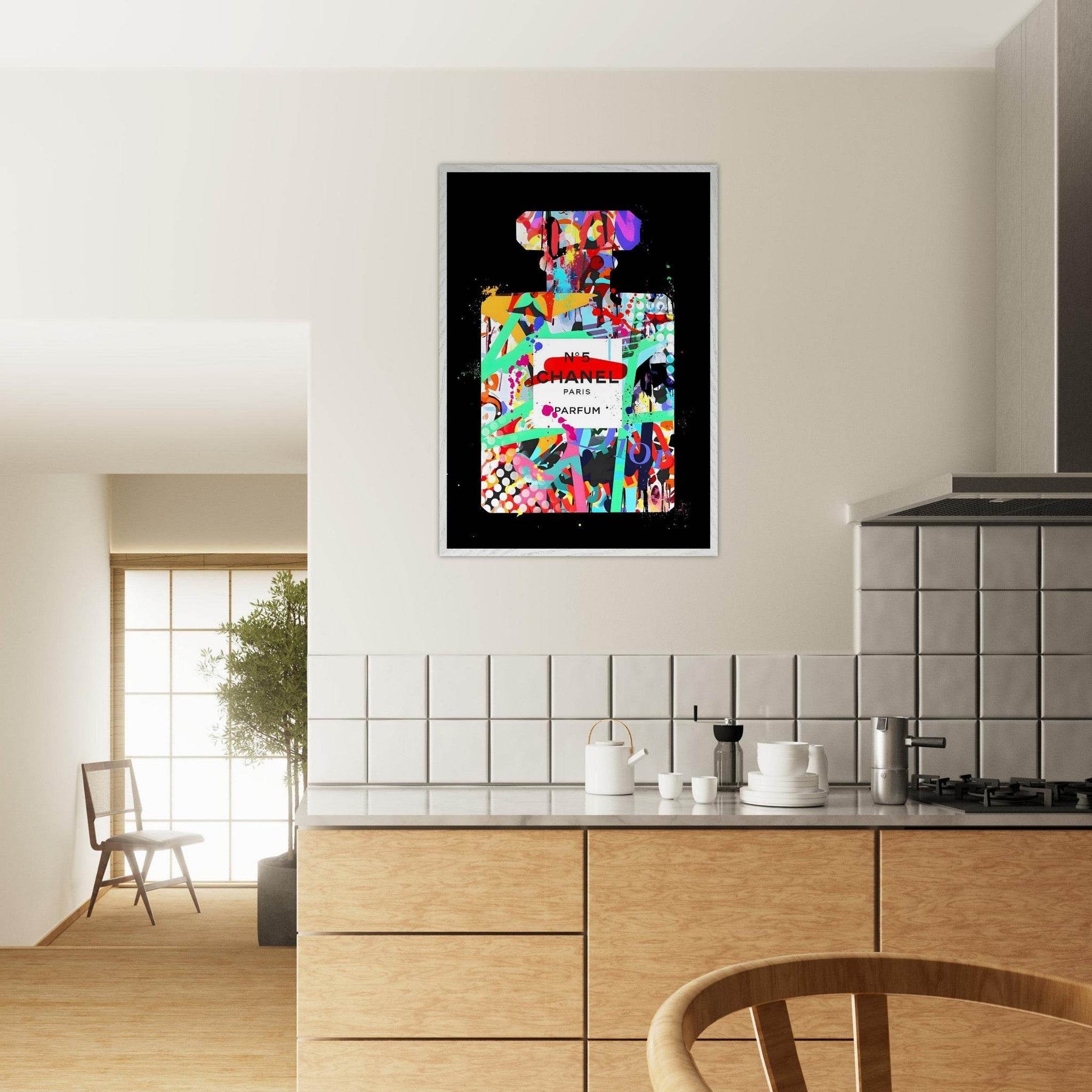 Crafted with meticulous attention to detail, this art piece pays homage to the legendary Chanel No. 5 perfume, one of the most recognized fragrances in the world. The vivid colors used in the artwork not only make it visually appealing but also breathe life into your living space, turning any room into a gallery of modern elegance. The Vibrant Pop Art Chanel No. 5 Perfume Print - Framed & Ready-to-Hang serves as an ideal conversation starter and complements various interior styles.
