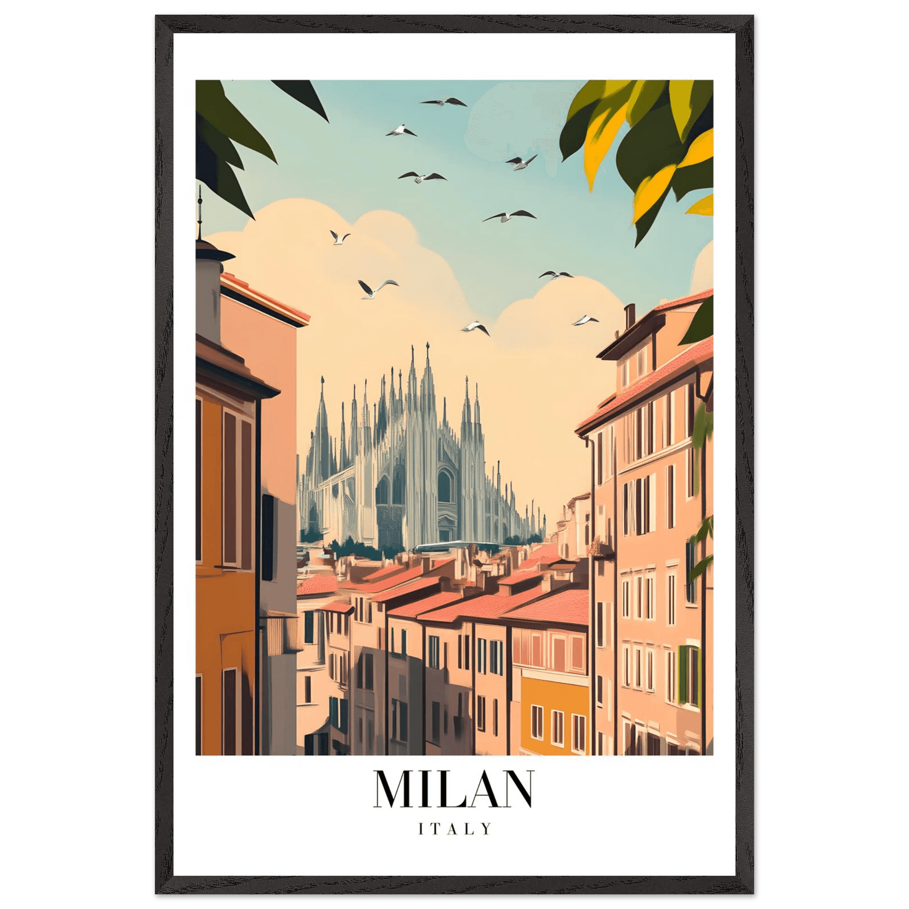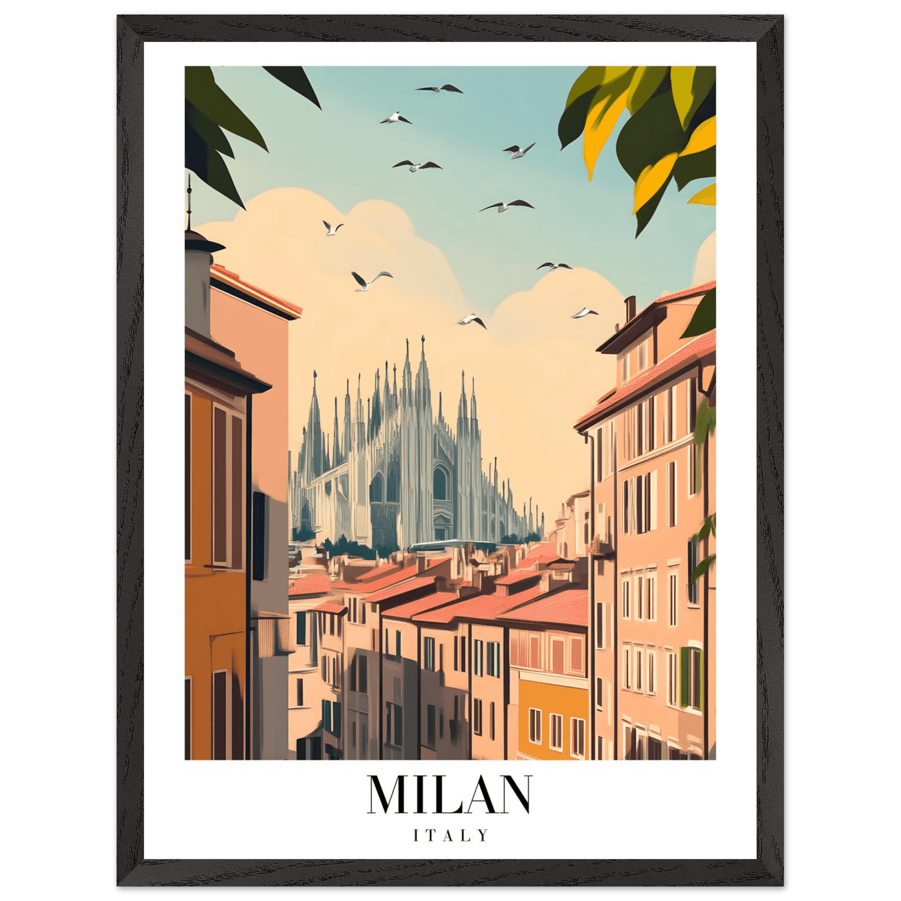 Milan Italy Framed Poster – Vintage Travel Wall Art with Duomo View & Wooden Frame