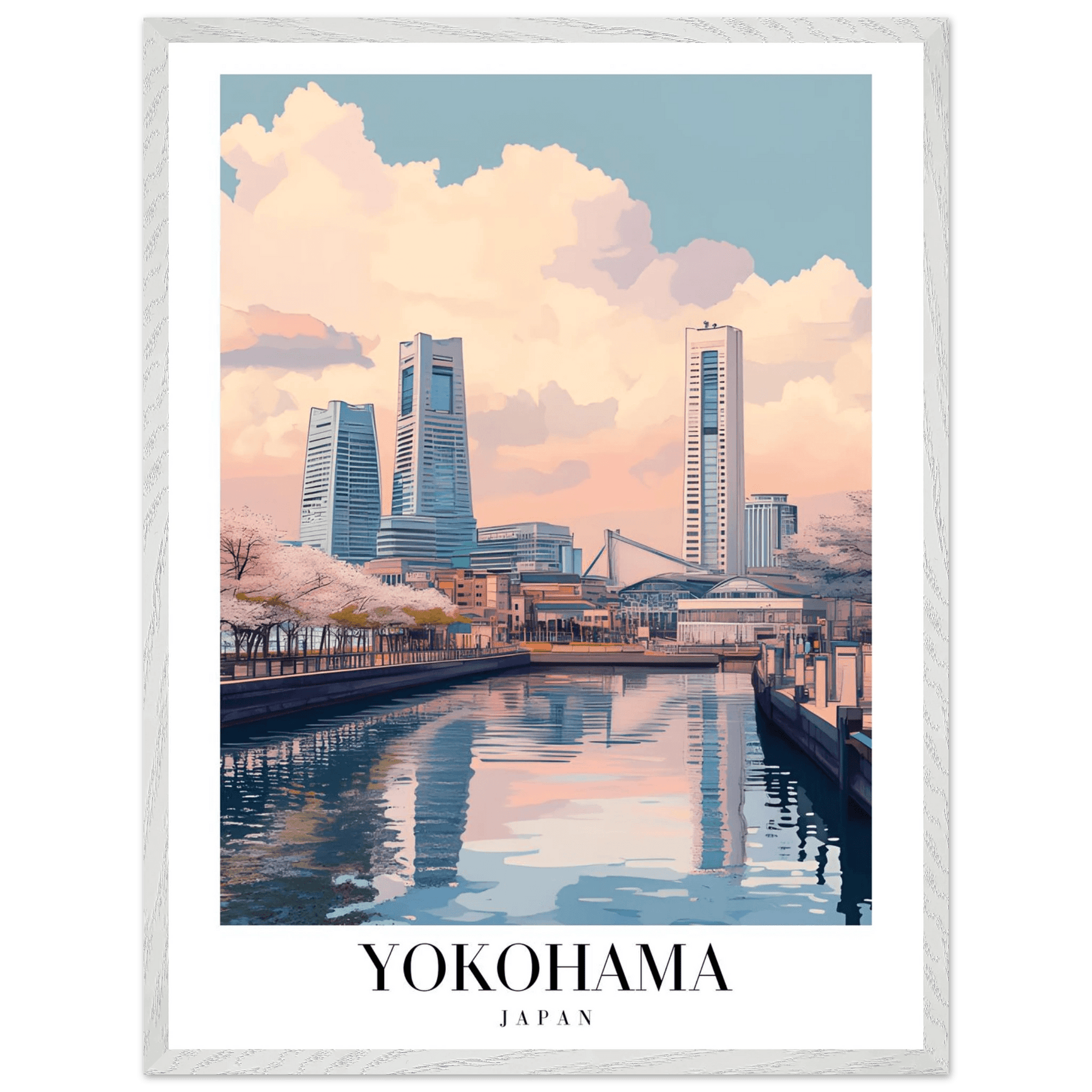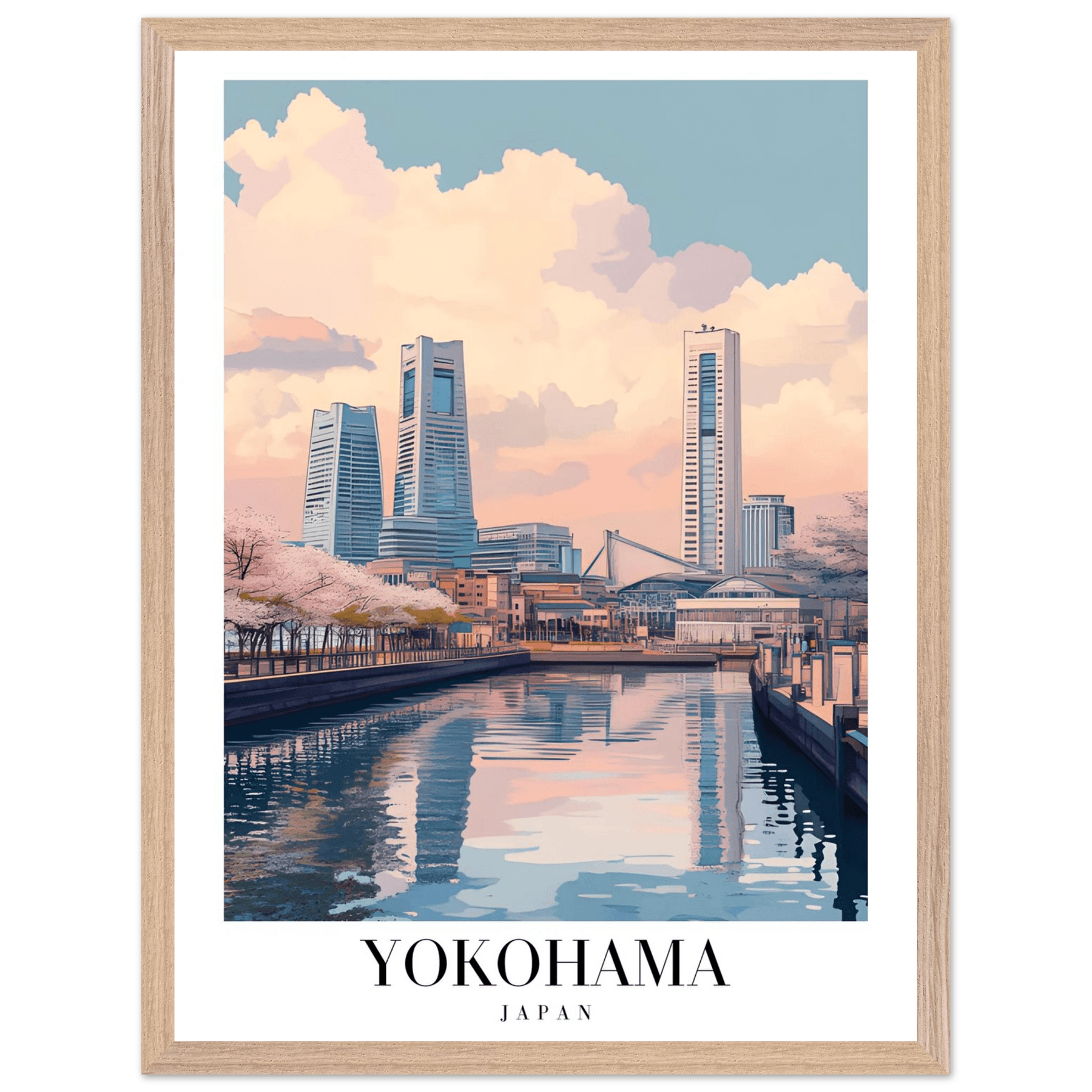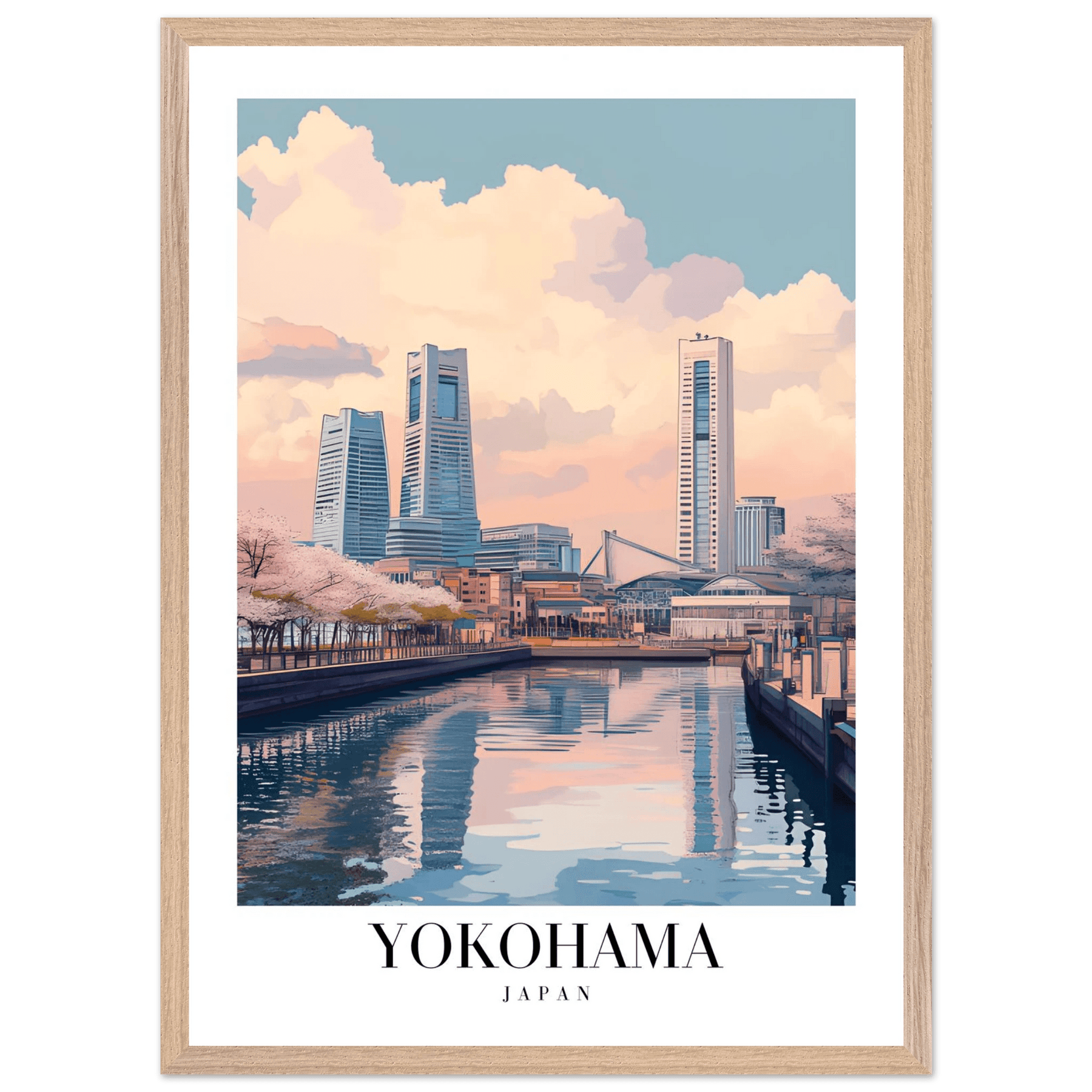 Yokohama Japan Framed Poster – Serene Pastel Cityscape Wall Art with Wooden Frame