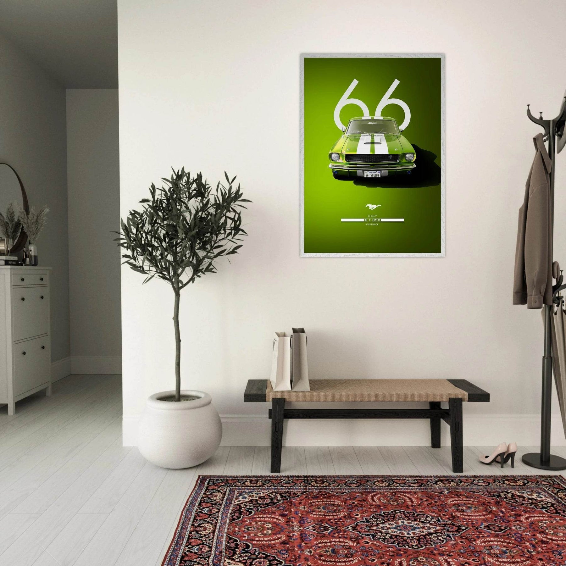 The 1966 Shelby GT350 Fastback Poster - Iconic Green & White Racing Stripes | Premium Framed Art, Ready-to-Hang is a striking representation of automotive history. This iconic piece captures the essence of the legendary 1966 Shelby GT350, celebrated for its performance and timeless design. Perfect for car enthusiasts and collectors, this premium framed art piece adds a touch of elegance to any room.