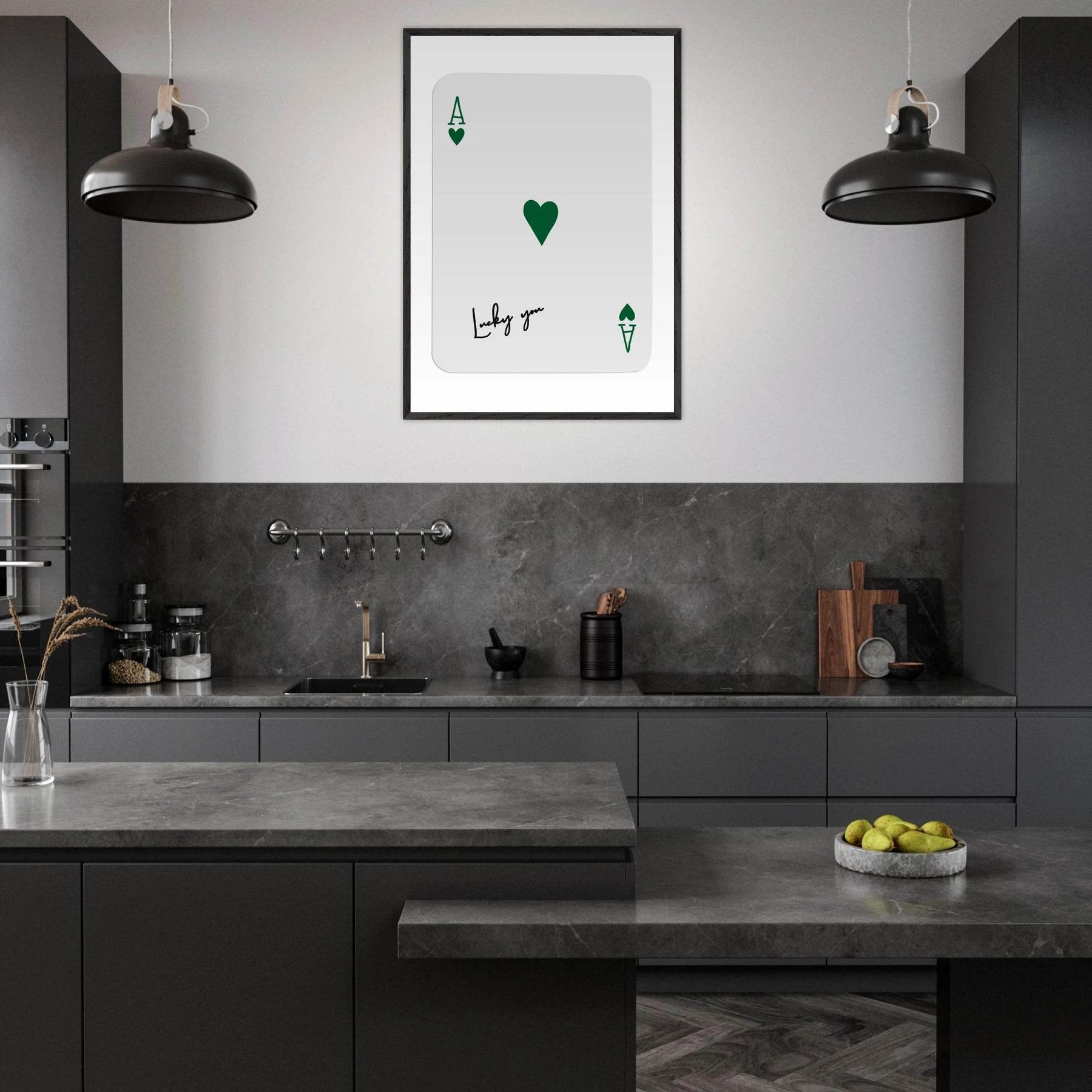 This art piece showcases the iconic Ace of Hearts poker card, surrounded by deep green accents that elevate its visual impact. Crafted from recycled materials, each print is designed to meet high environmental standards while offering a premium look. Whether you're decorating your home, office, or game room, this artwork is sure to be a conversation starter.