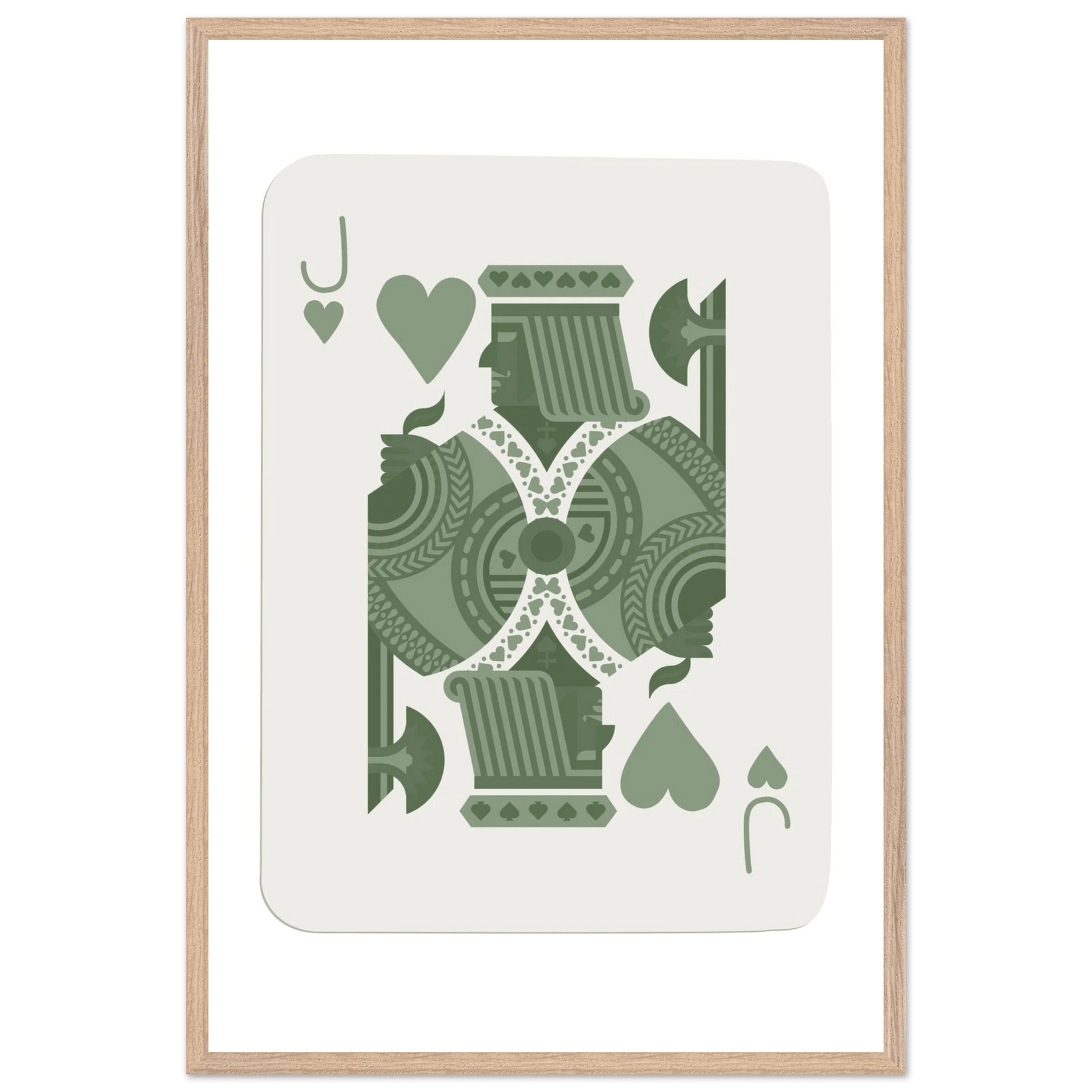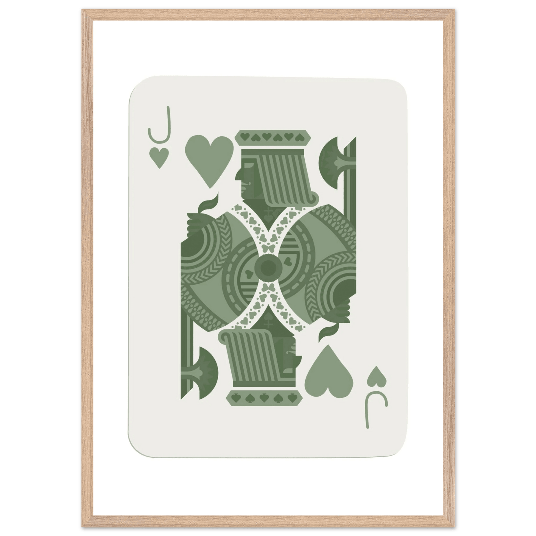 Printed on high-quality eco-friendly paper, this artwork not only looks great but is also kind to the planet. The minimalist aesthetic emphasizes the shapes and colors of the Jack of Hearts, creating a striking visual impact that will grab attention in any space. The wooden frame adds a touch of elegance and sophistication, elevating the overall presentation.