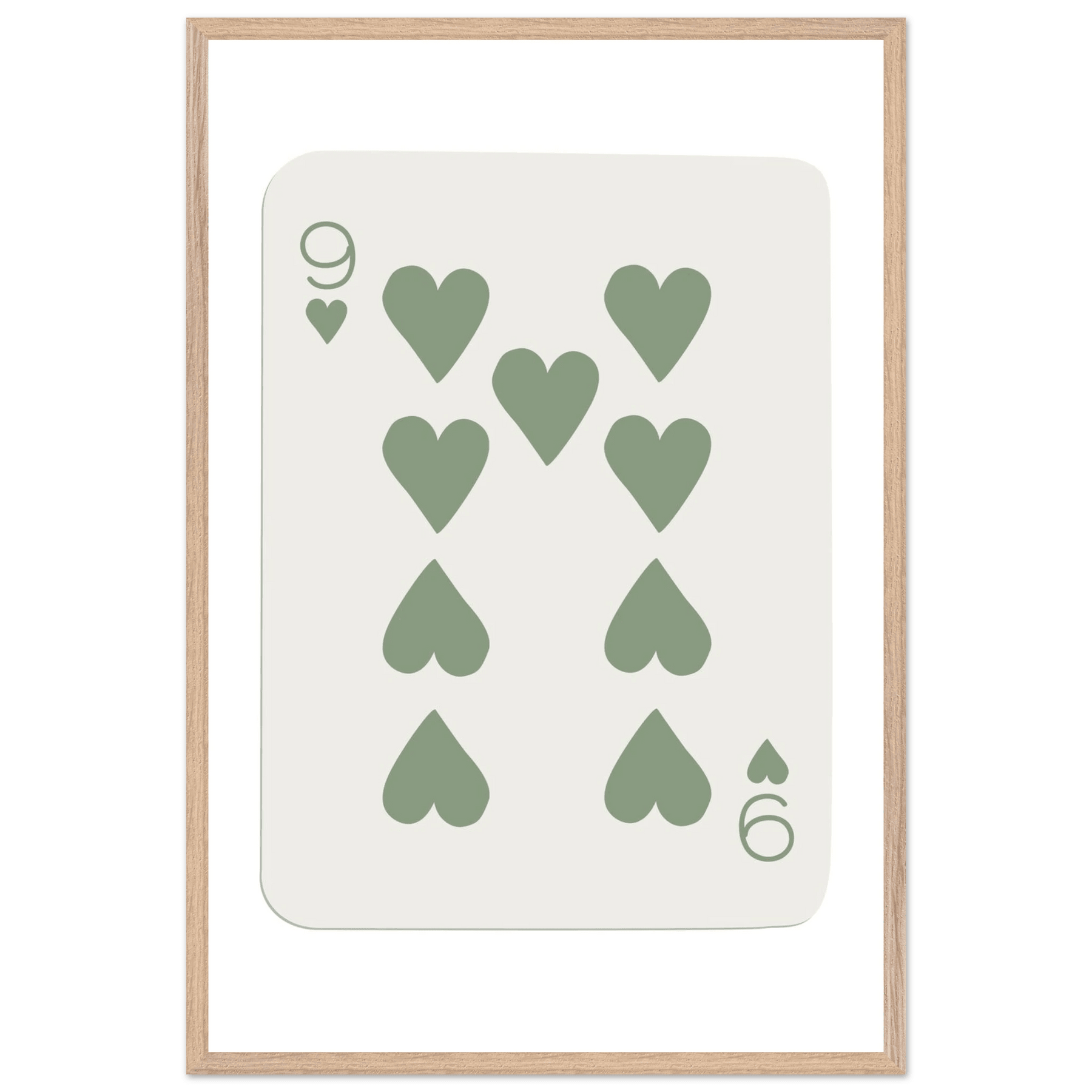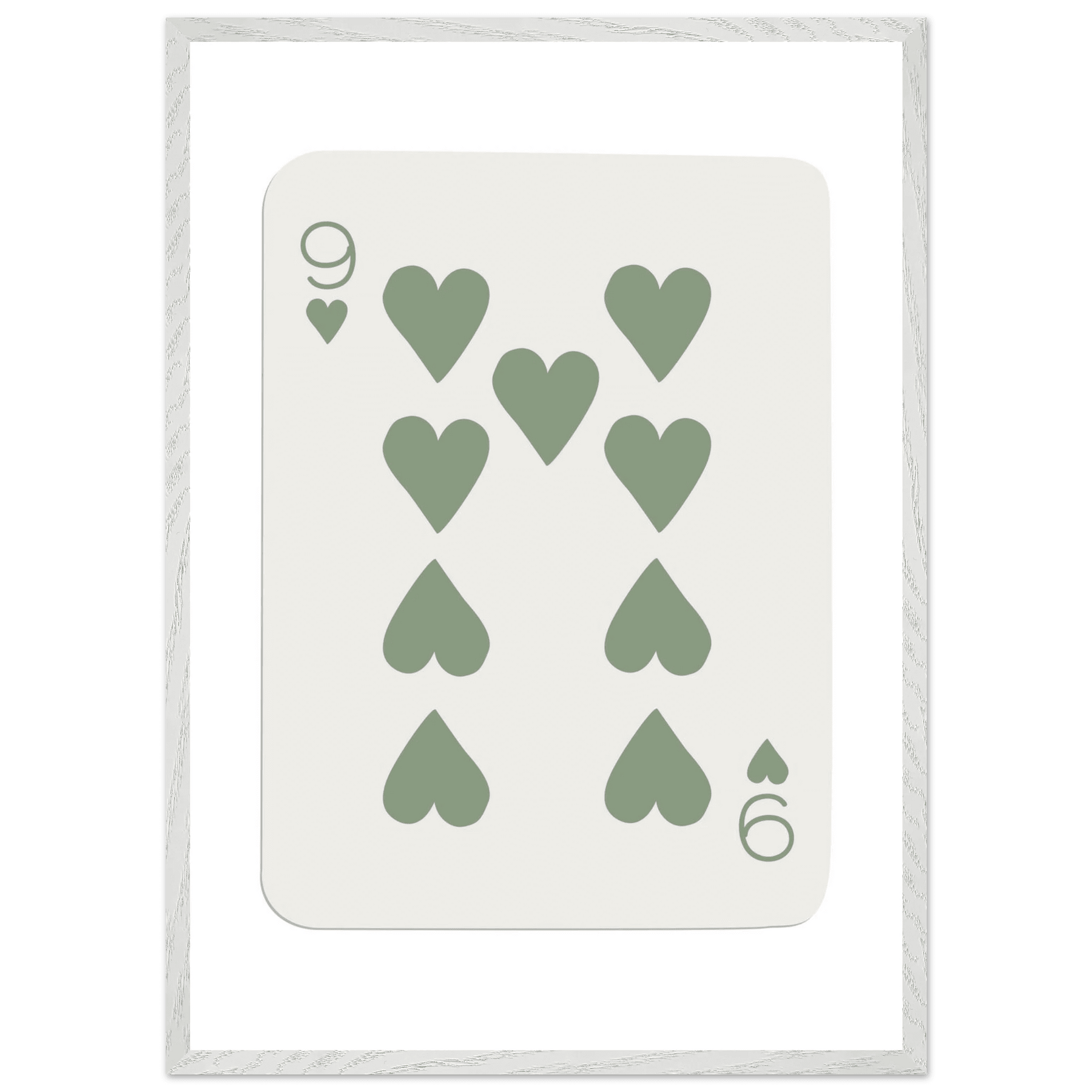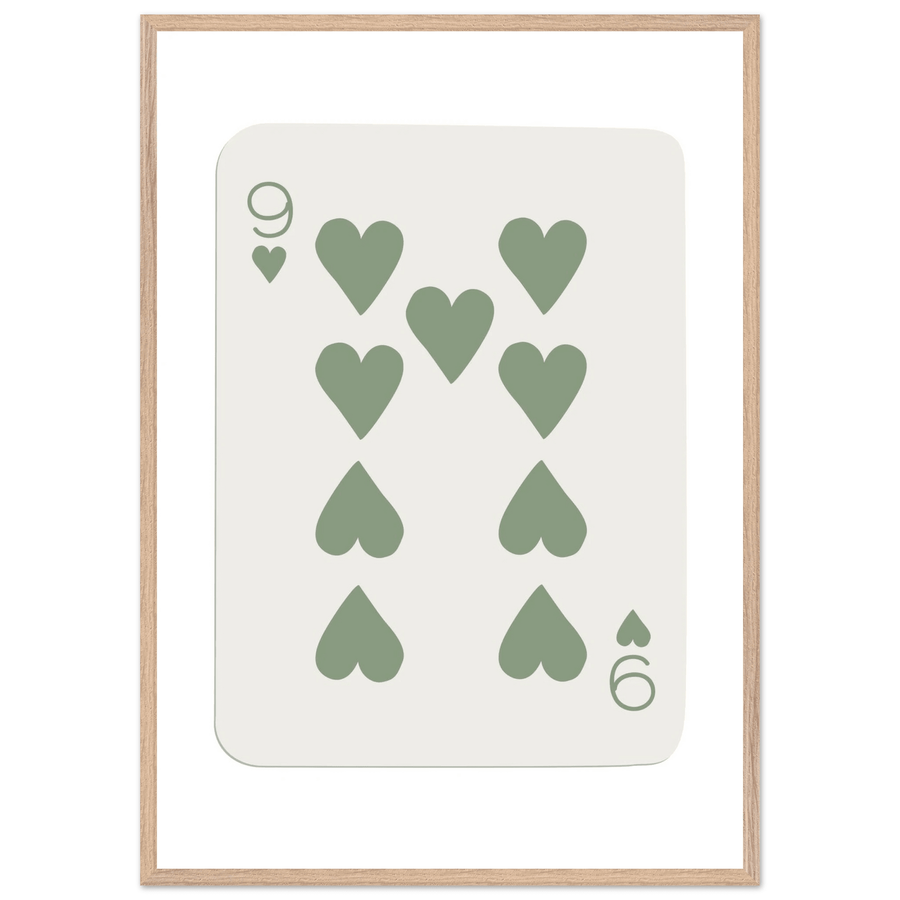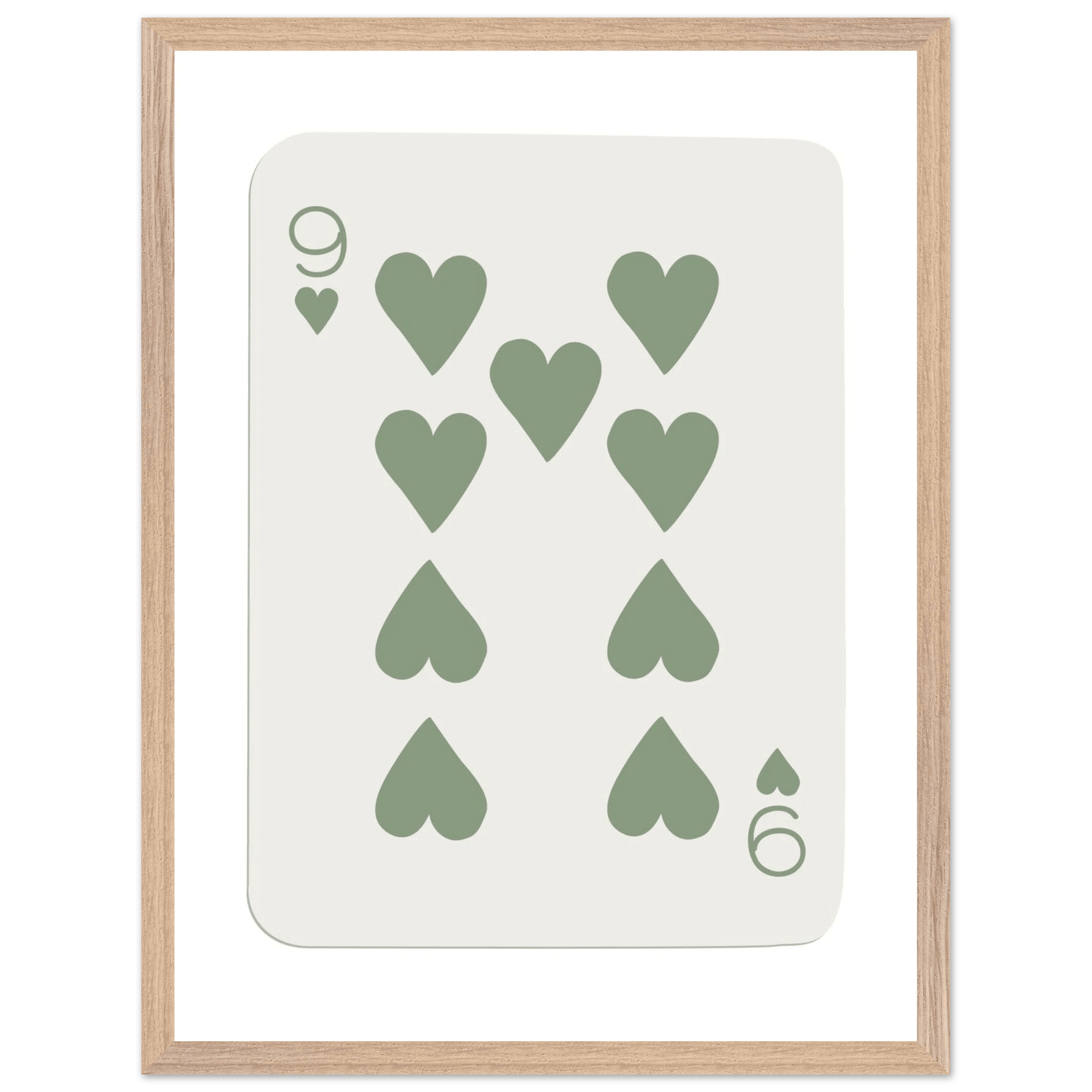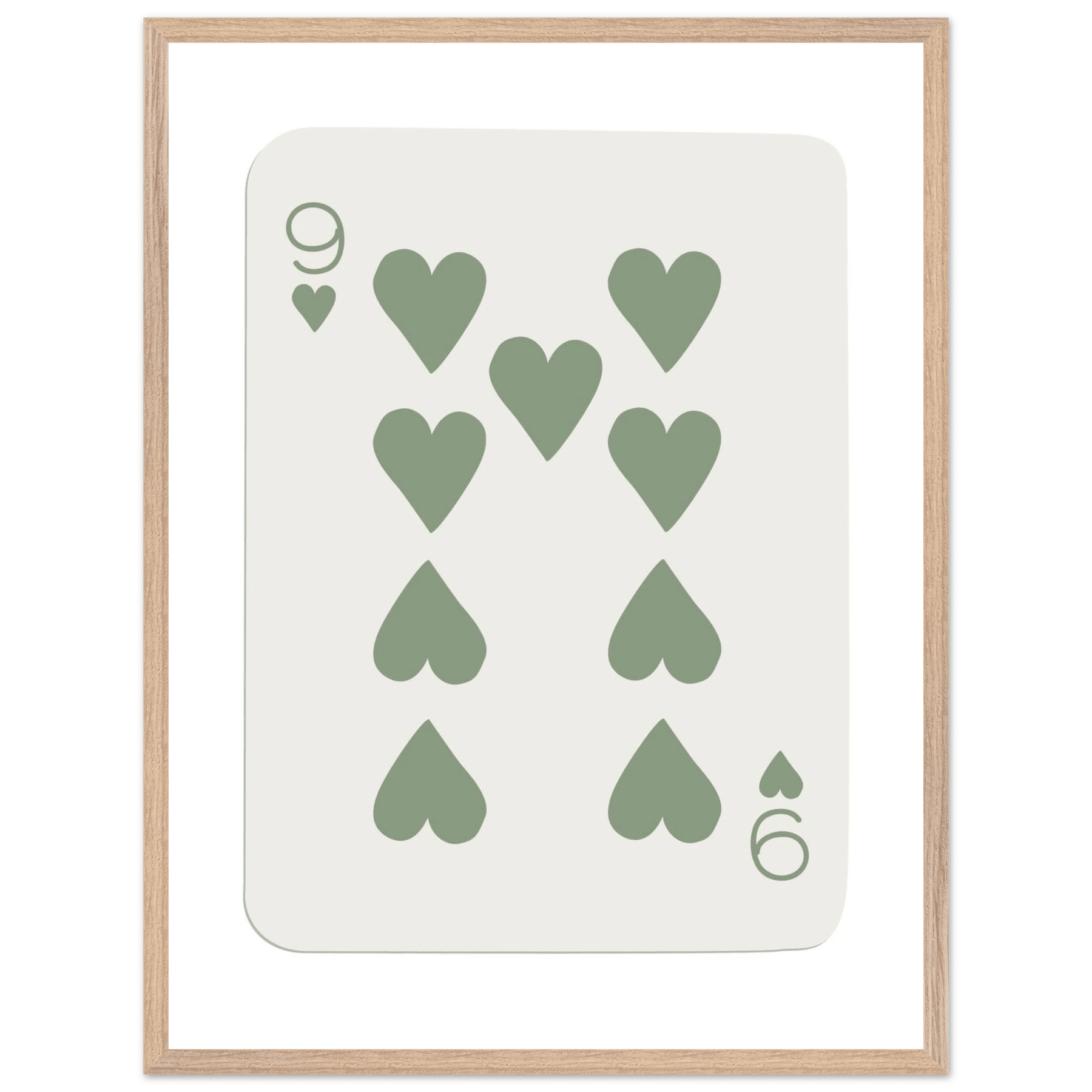Minimalist Nine of Hearts Poker Card Print - Mounted Framed Wall Art, Sage Green Boho Decor, Eco-Friendly Wood Frame - Vibrantwalls