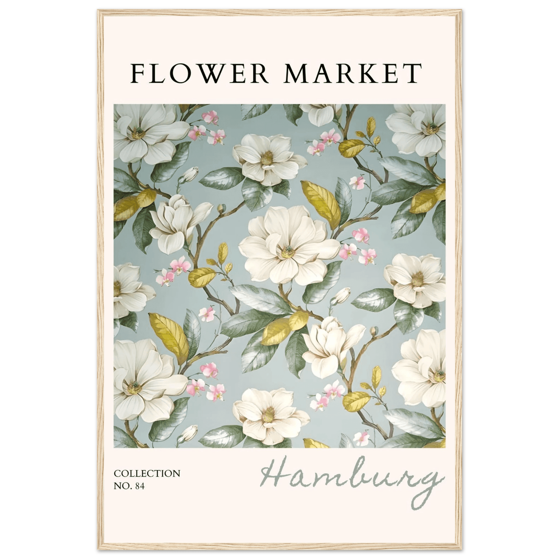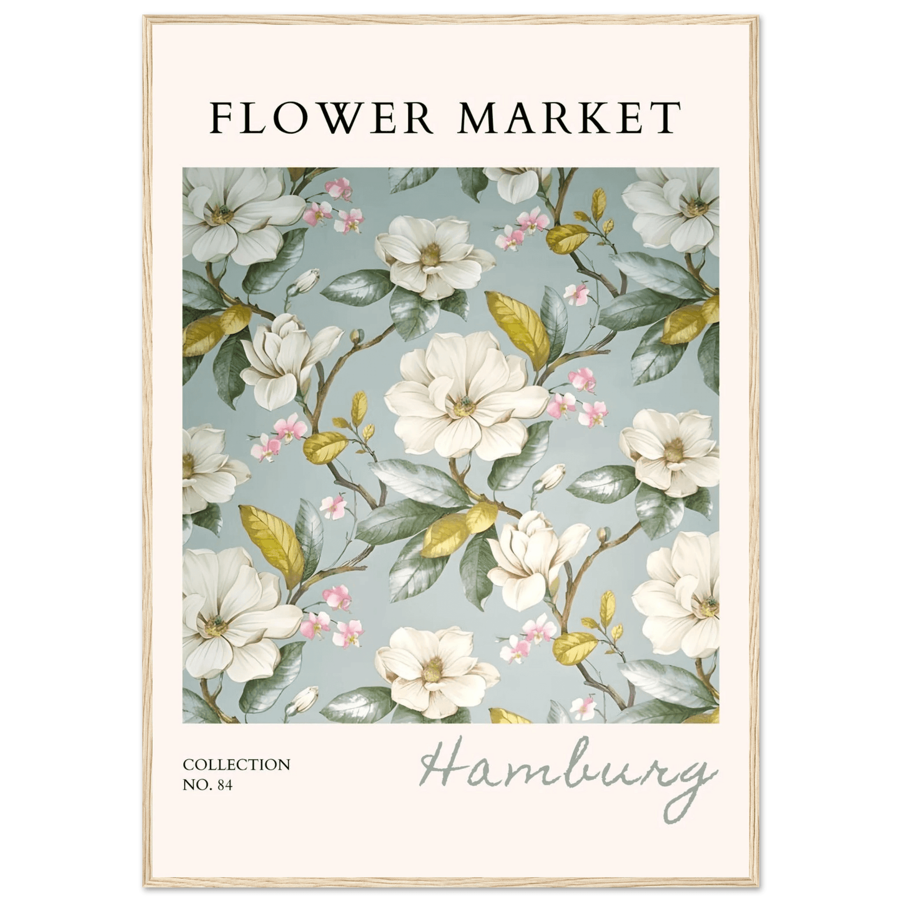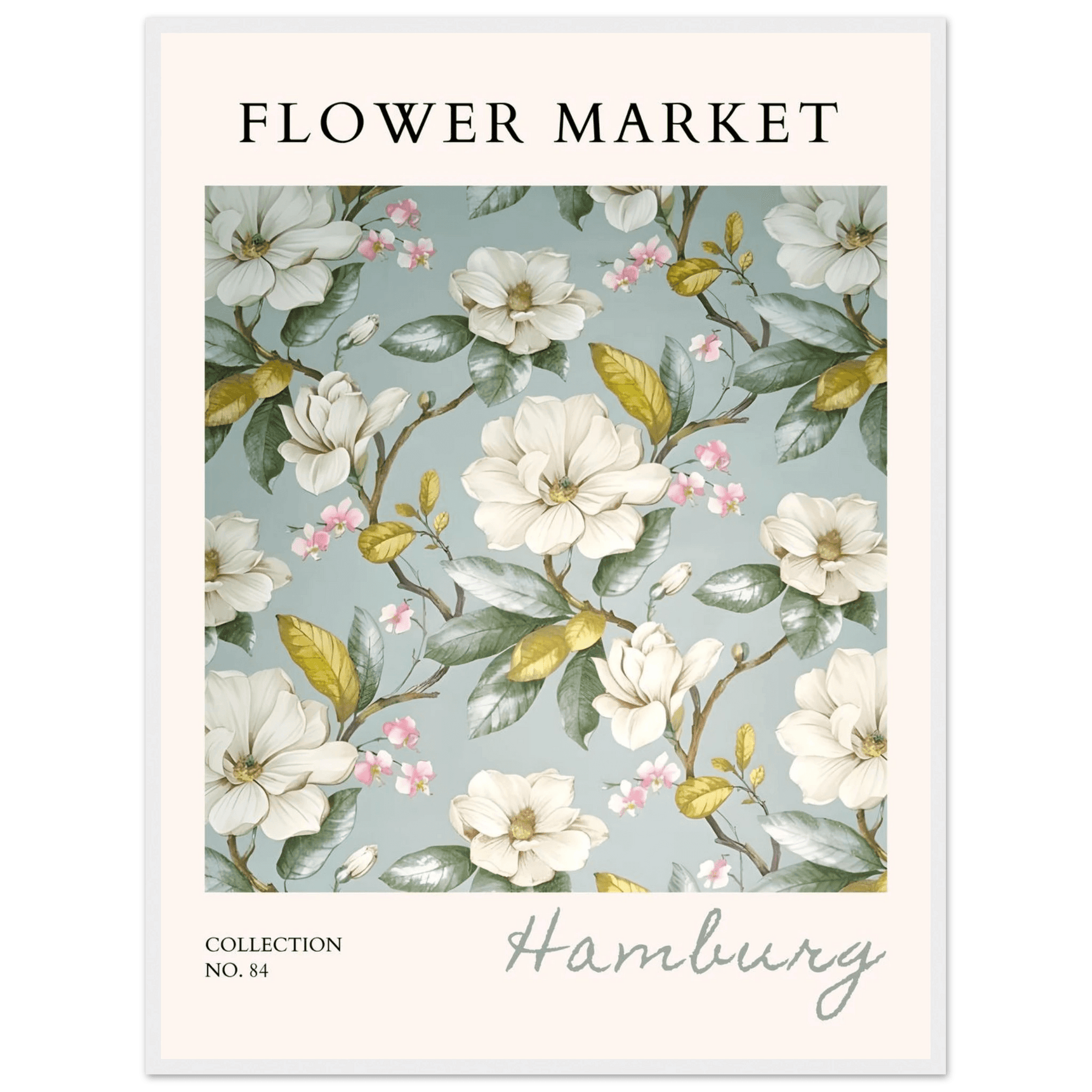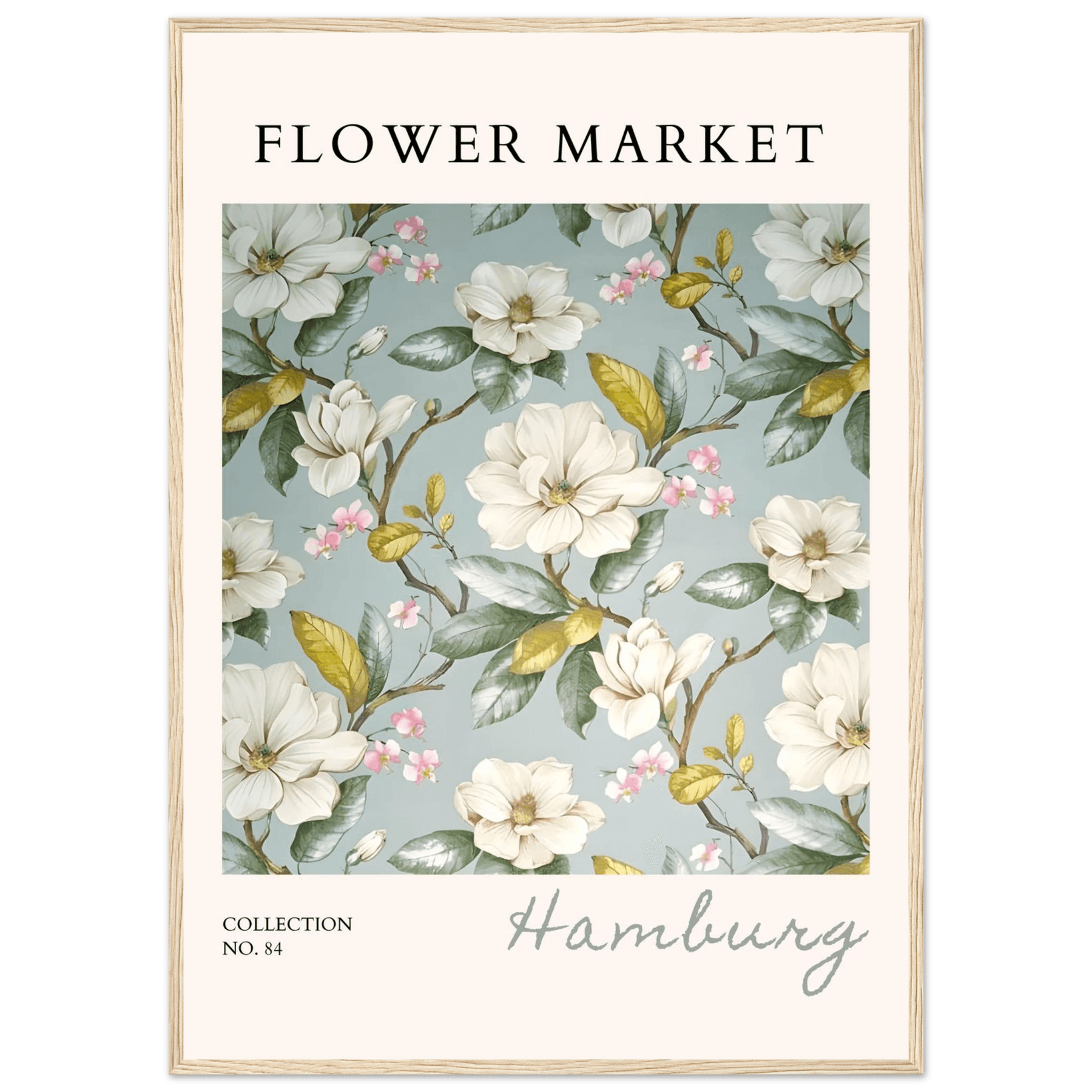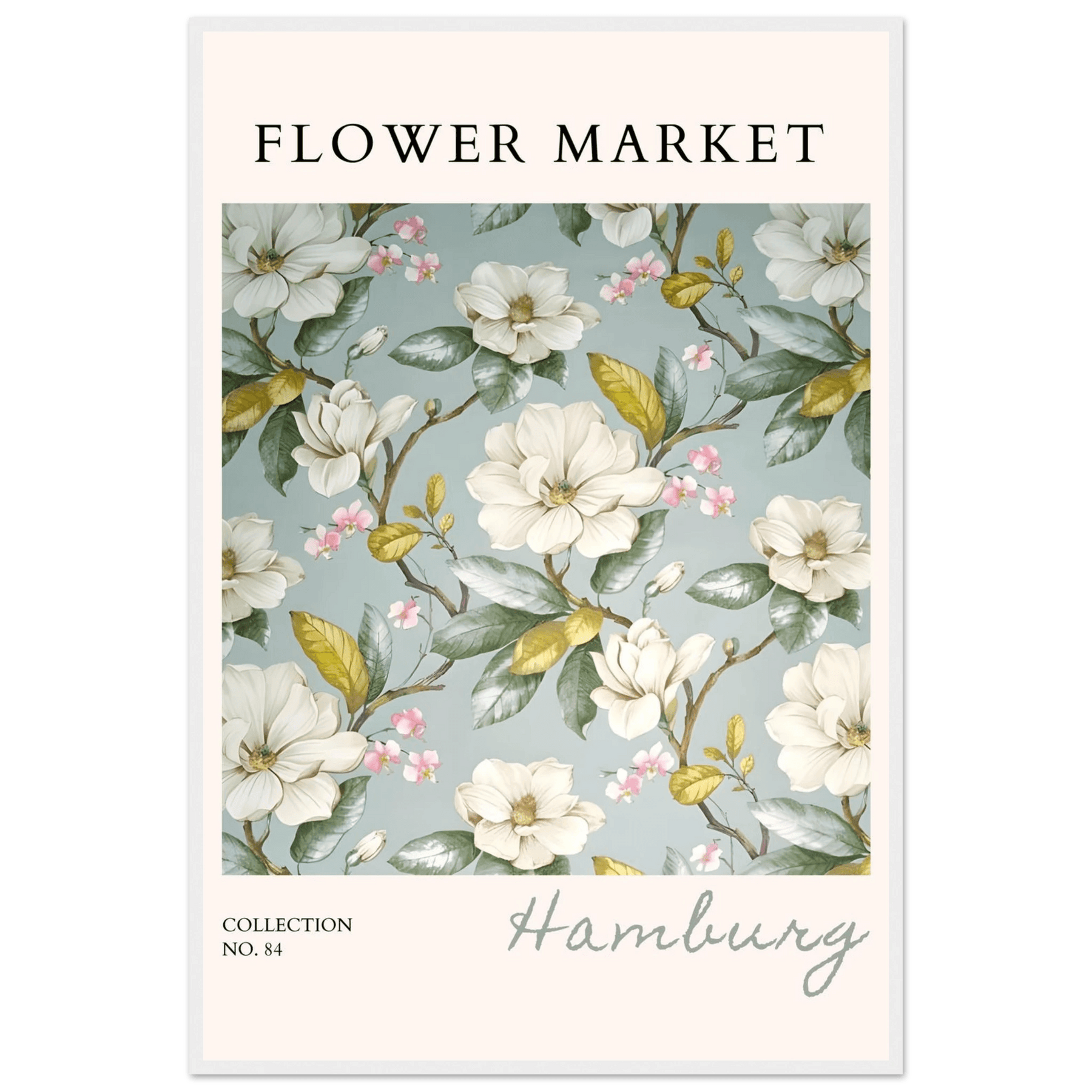 Each element in this art print is carefully curated to reflect the beauty of flower markets, reminiscent of the seasonal blooms found in Hamburg. The elegant magnolia and cherry blossoms symbolize grace and renewal, making this print not just a piece of art but also a meaningful representation of nature's cycles.