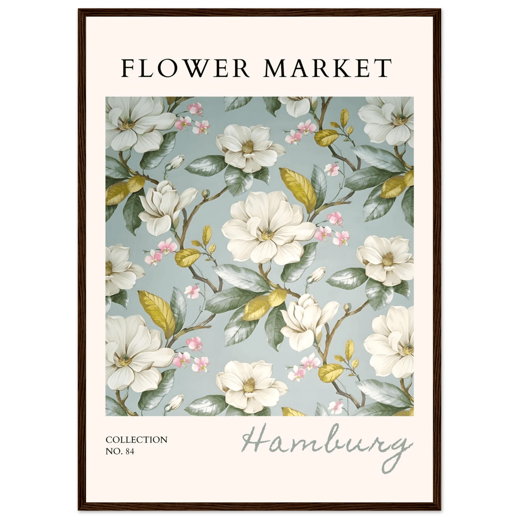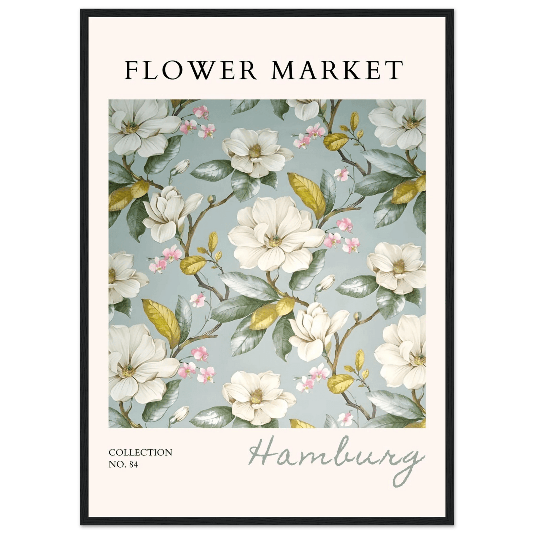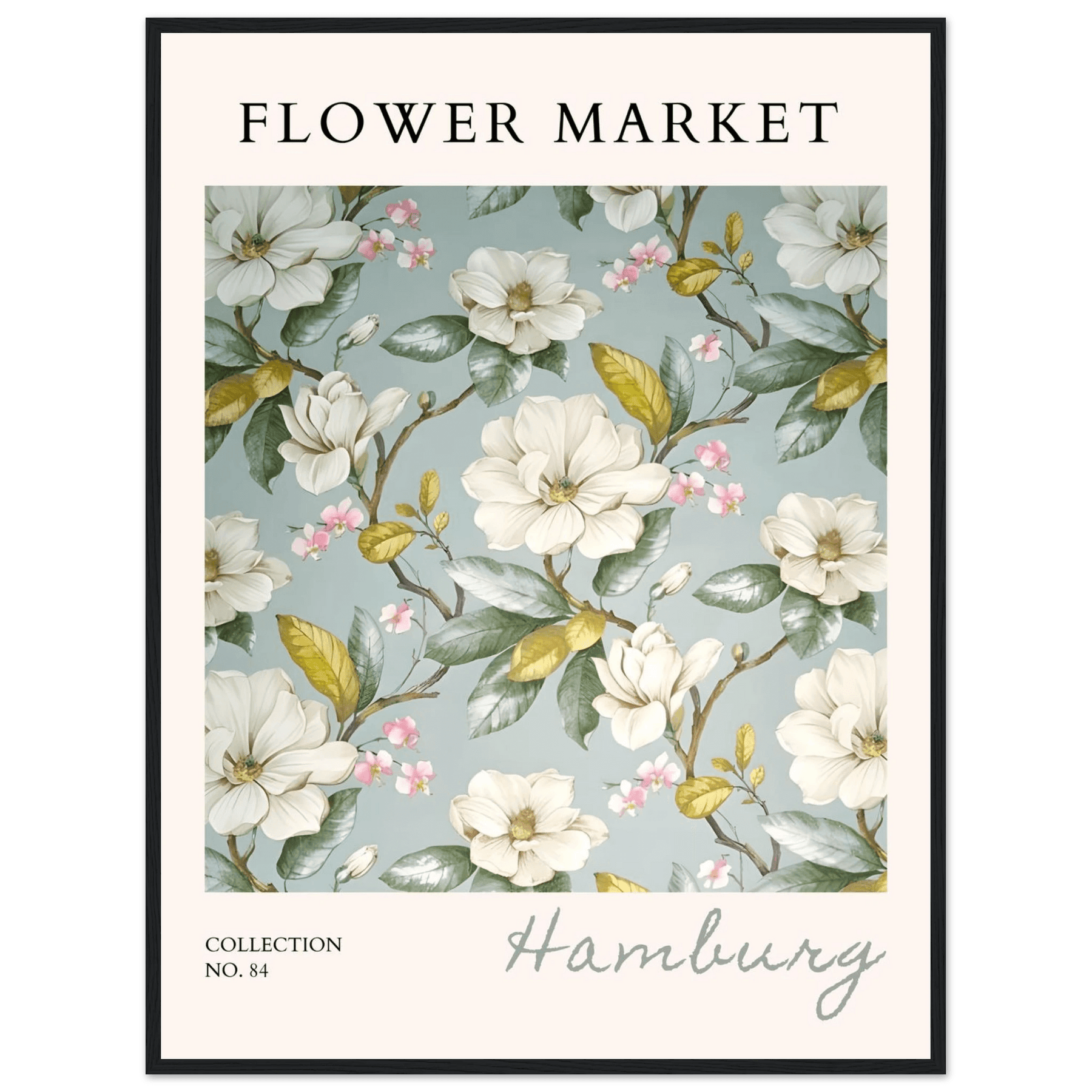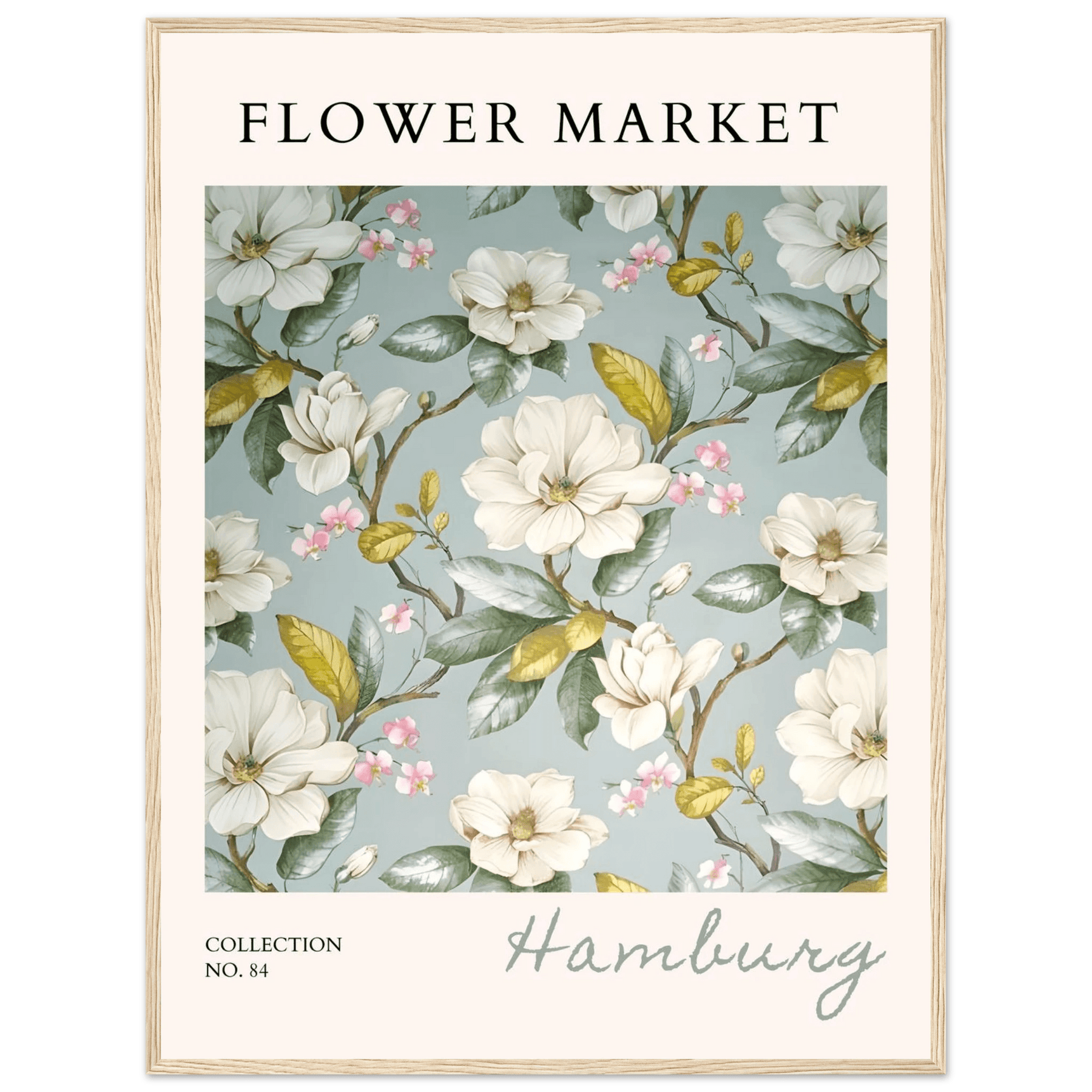 Each element in this art print is carefully curated to reflect the beauty of flower markets, reminiscent of the seasonal blooms found in Hamburg. The elegant magnolia and cherry blossoms symbolize grace and renewal, making this print not just a piece of art but also a meaningful representation of nature's cycles.