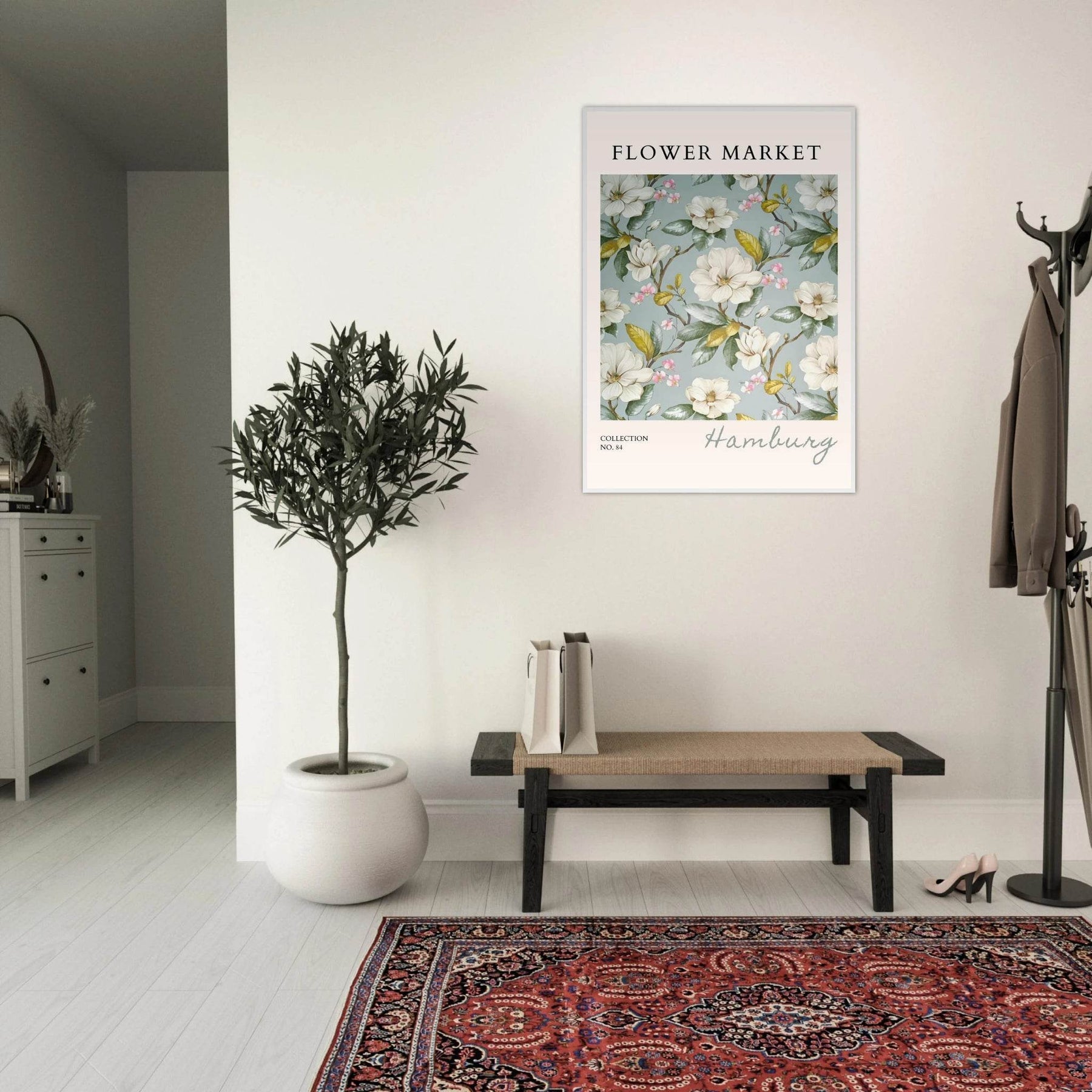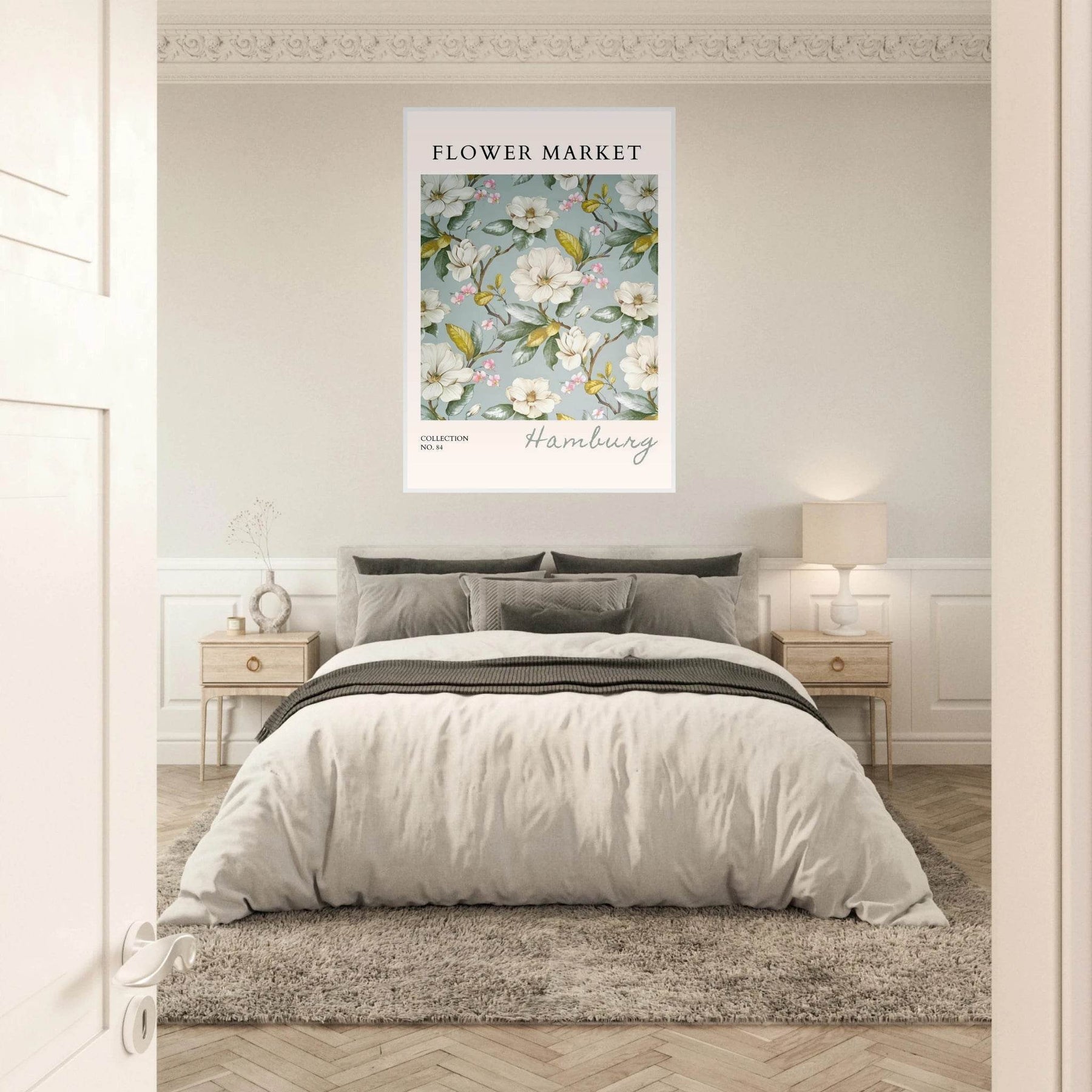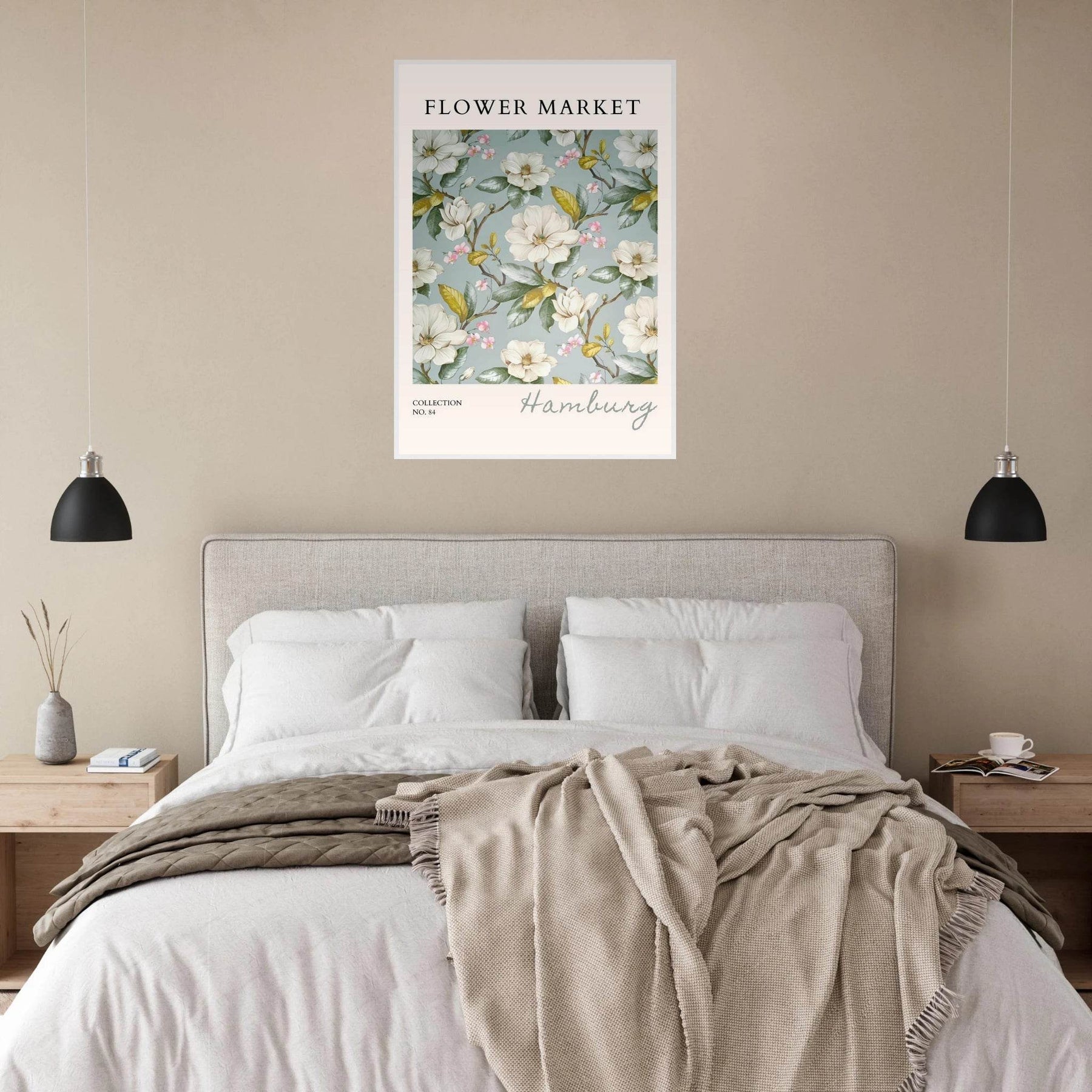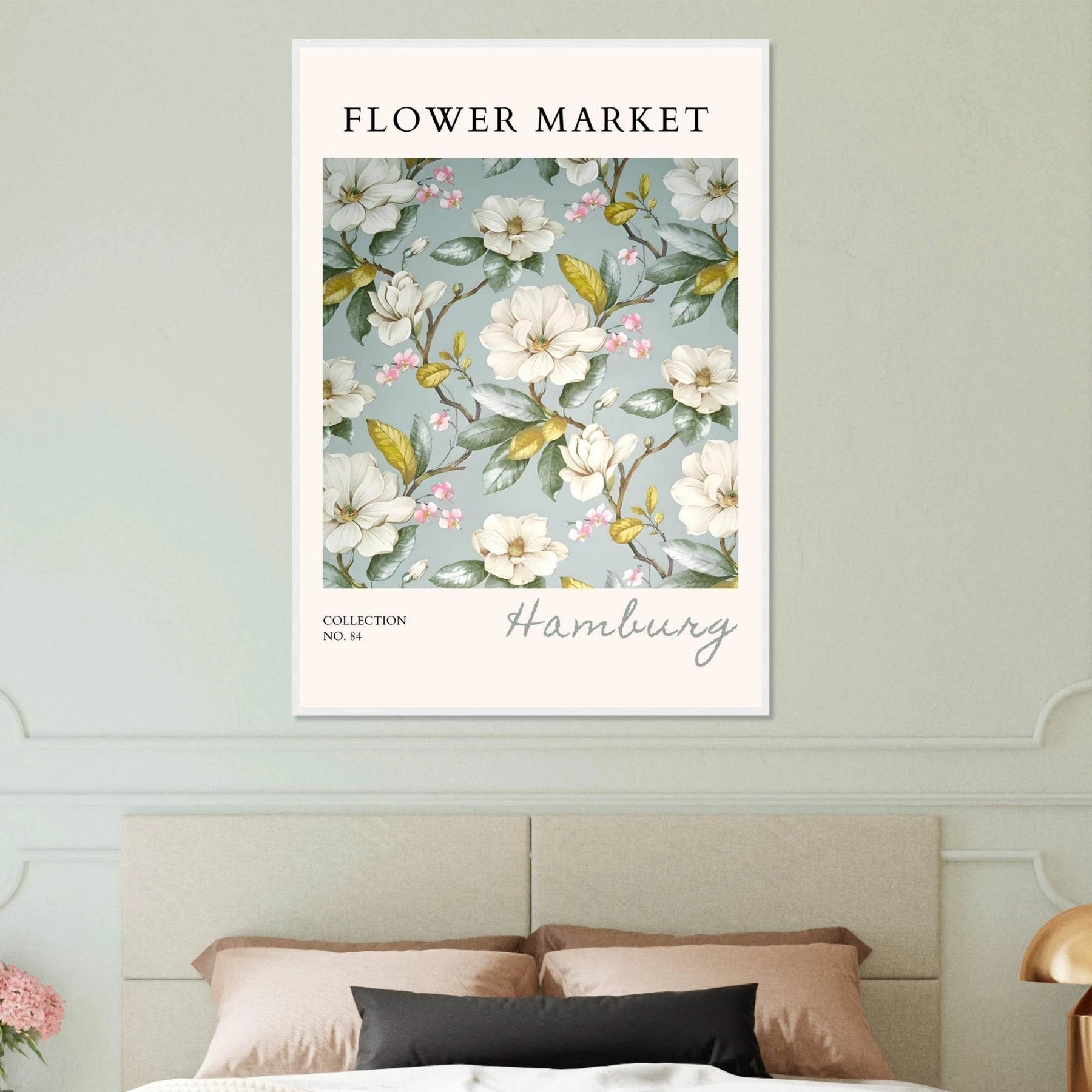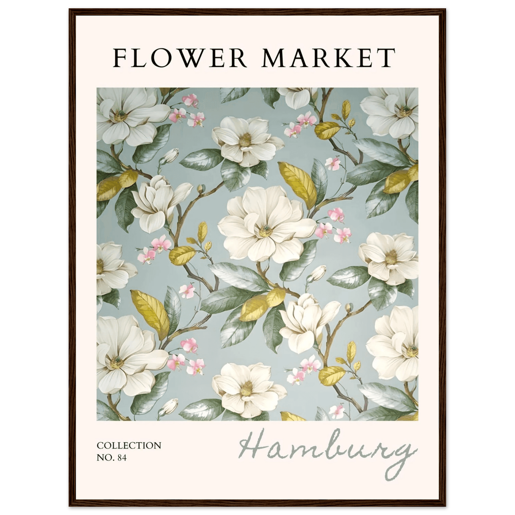 Each element in this art print is carefully curated to reflect the beauty of flower markets, reminiscent of the seasonal blooms found in Hamburg. The elegant magnolia and cherry blossoms symbolize grace and renewal, making this print not just a piece of art but also a meaningful representation of nature's cycles.