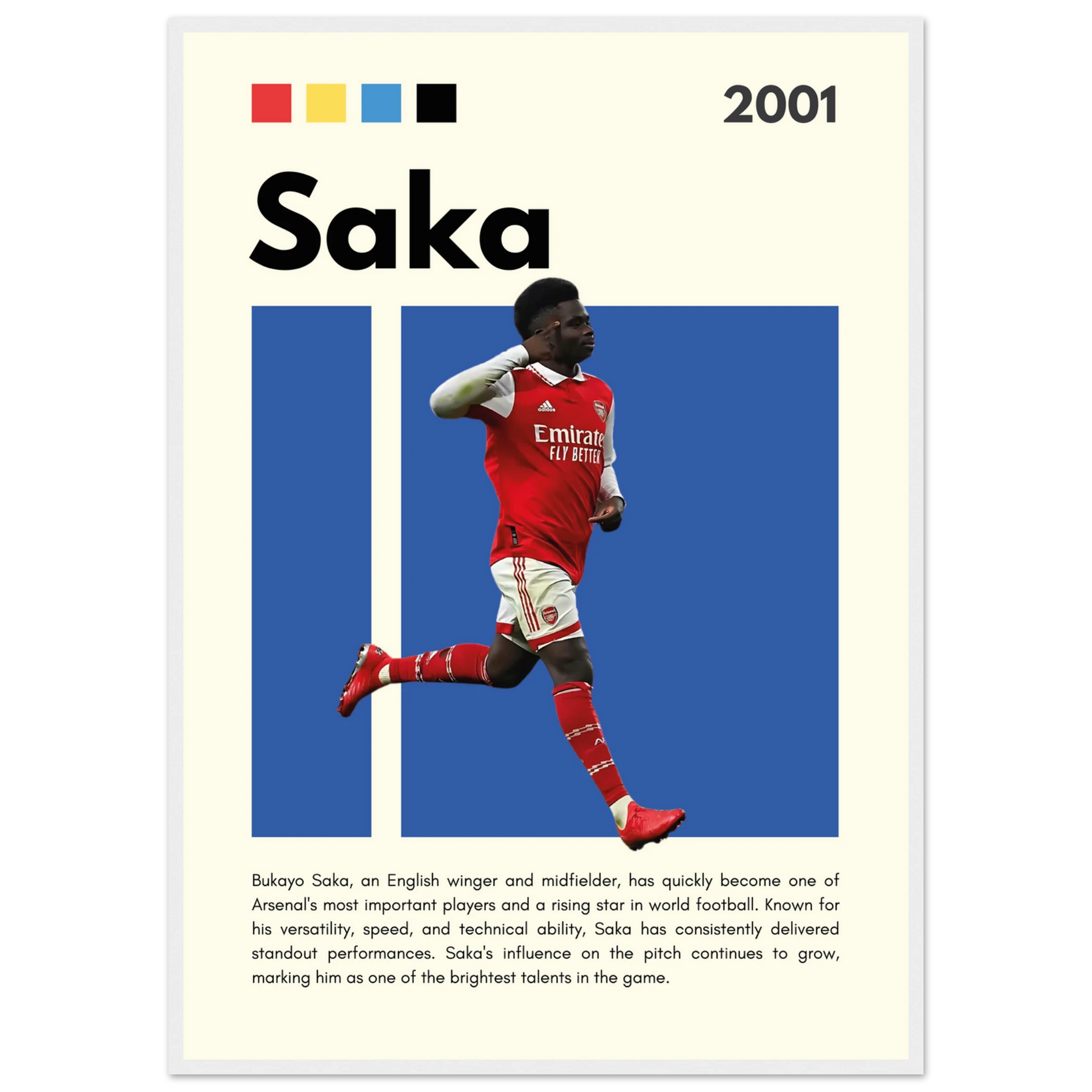 This Bukayo Saka poster doesn't just capture a moment; it encapsulates a movement, making it essential for anyone who believes in the magic of Arsenal football. Each glance will remind you of the joy, excitement, and pride of being a Gooner. Show your support for Bukayo Saka and Arsenal by bringing this modern football art print into your life.